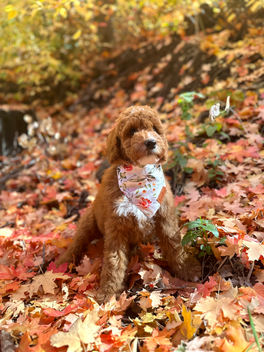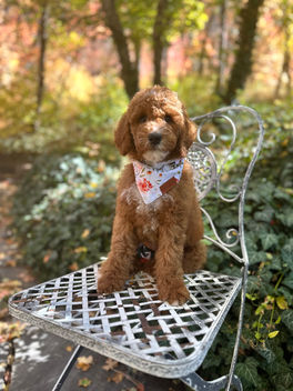 Ember has been perfect from the beginning. Produced, raised and trained here at the Curl Squad, we knew Ember was special from the first weeks of her life. She is focused, calm, mature & snuggly. Her coat is doodle perfection and everything about her is Therapy Dog perfection. She wants to calmly and lovingly say hi to everyone she sees and is an incredible emotional support to her Guardian Family. She is a natural mother to others pups and has so many nurturing qualities. She has a very low prey drive, great food motivation and and incredible mature demeanor in public just like her Mama Rory.